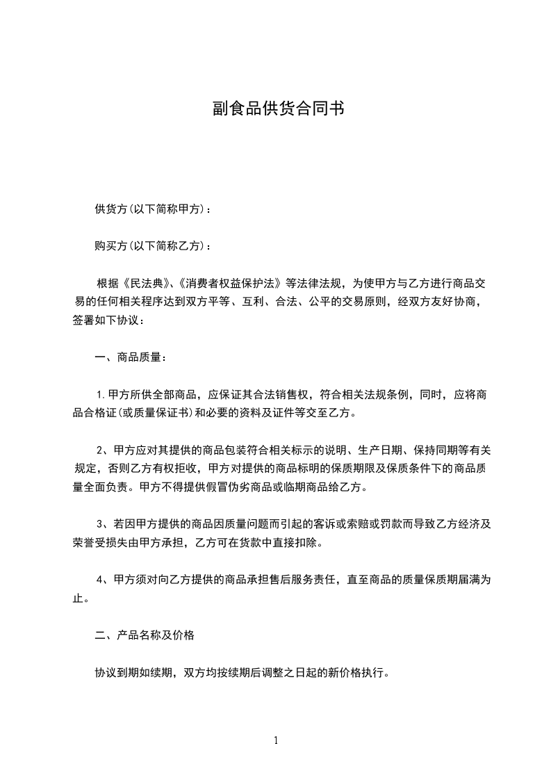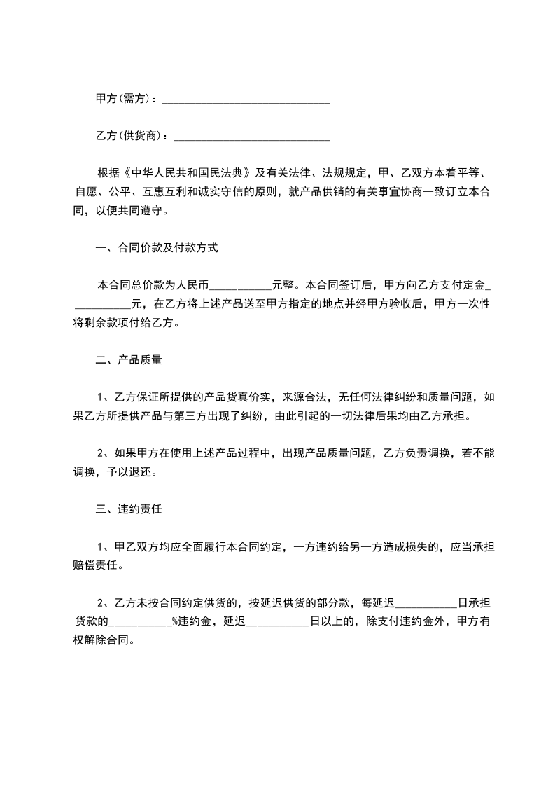 根据《中华人民共和国民法典》及有关法律、法规规定,甲、乙双方本着平等、自愿、公平、互惠互利和诚实守信的原则,就产品供销的有关事宜协商一致订立本合同,以便共同遵守。