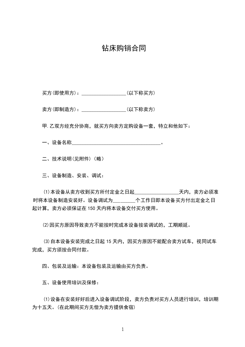 (1)本设备从卖方收到买方所付定金之日起__________________天内,卖方必须准时将本设备制造安装好。设备调试为_________个工作日即本设备买方付出定金之日起计算,卖方必须保证在150天内将本设备交付买方使用。