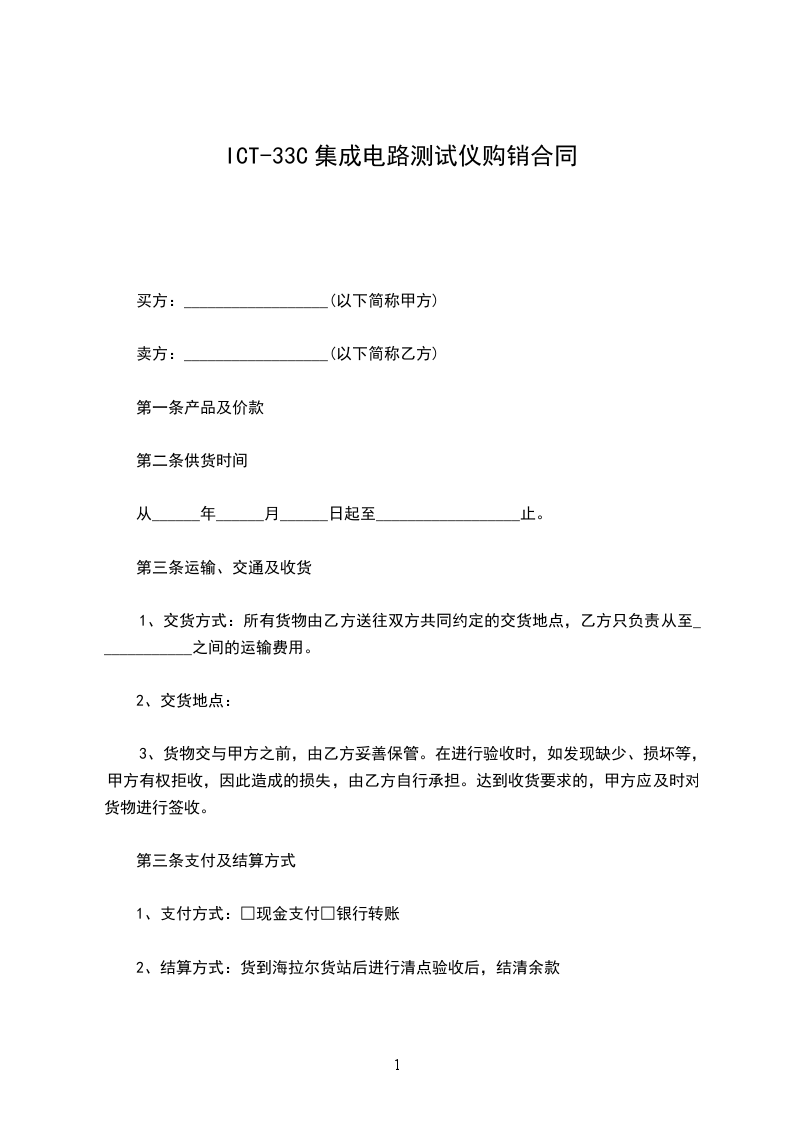1、交货方式:所有货物由乙方送往双方共同约定的交货地点,乙方只负责从至____________之间的运输费用。