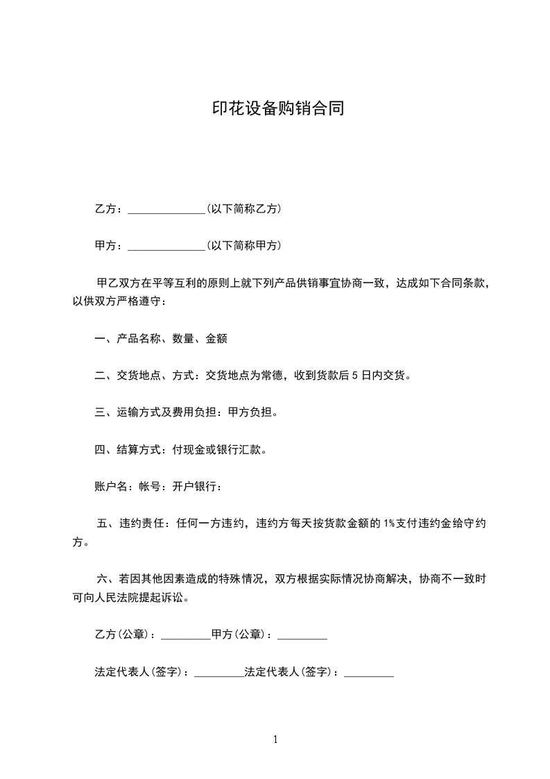 五、违约责任:任何一方违约,违约方每天按货款金额的1%支付违约金给守约方。