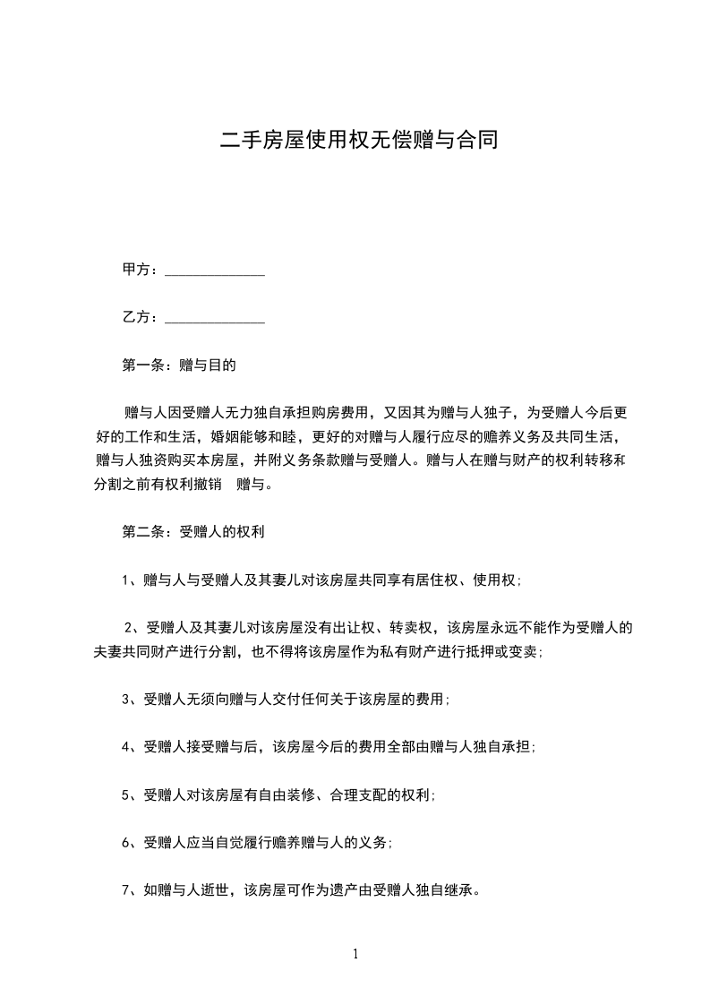 3、受赠人无须向赠与人交付任何关于该房屋的费用;