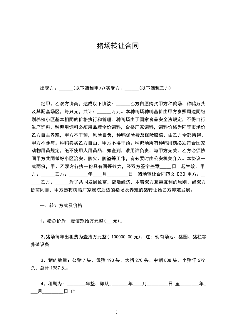 经甲、乙双方协商,达成以下协议:______乙方自愿购买甲方种鸭场,种鸭万头及其配套场区,每只元,共计:______万元。本种鸭场种鸭基价由甲方参照周边同级别养殖小区基本相同的价格执行和管理。种鸭场由于国家食品安全法规定,不得自行生产饲料,种鸭用饲料必须用品牌全价饲料,合格厂家饲料,饲料价格为同等市场价。乙方自主养殖,甲方不干预,风险自负,种鸭保险费及保险赔偿,由乙方全部所得,甲方不参与。种鸭卖买乙方自由,甲方不得干预。种鸭场所有种鸭用药必须符合国家动物用药规定,绝不使用人用药品,如查到,谁用谁负责,与甲方无关。乙方必须协同甲方共同做好小区治安、防火、防盗等工作,有必要时由公安机关介入。本协议一式两份,甲、乙双方各执一份具有同等效力,经双方签字盖章_____日 起生效。甲方:______乙方:________年____月_________日 猪场转让合同范文【2】甲方:______乙方:______为了共同发展致富,搞活经济,本着双方互惠互利的原则,经双方协商同意,甲方愿将树脂厂家属院后边的猪场及养殖的猪转让给乙方养殖发展。
