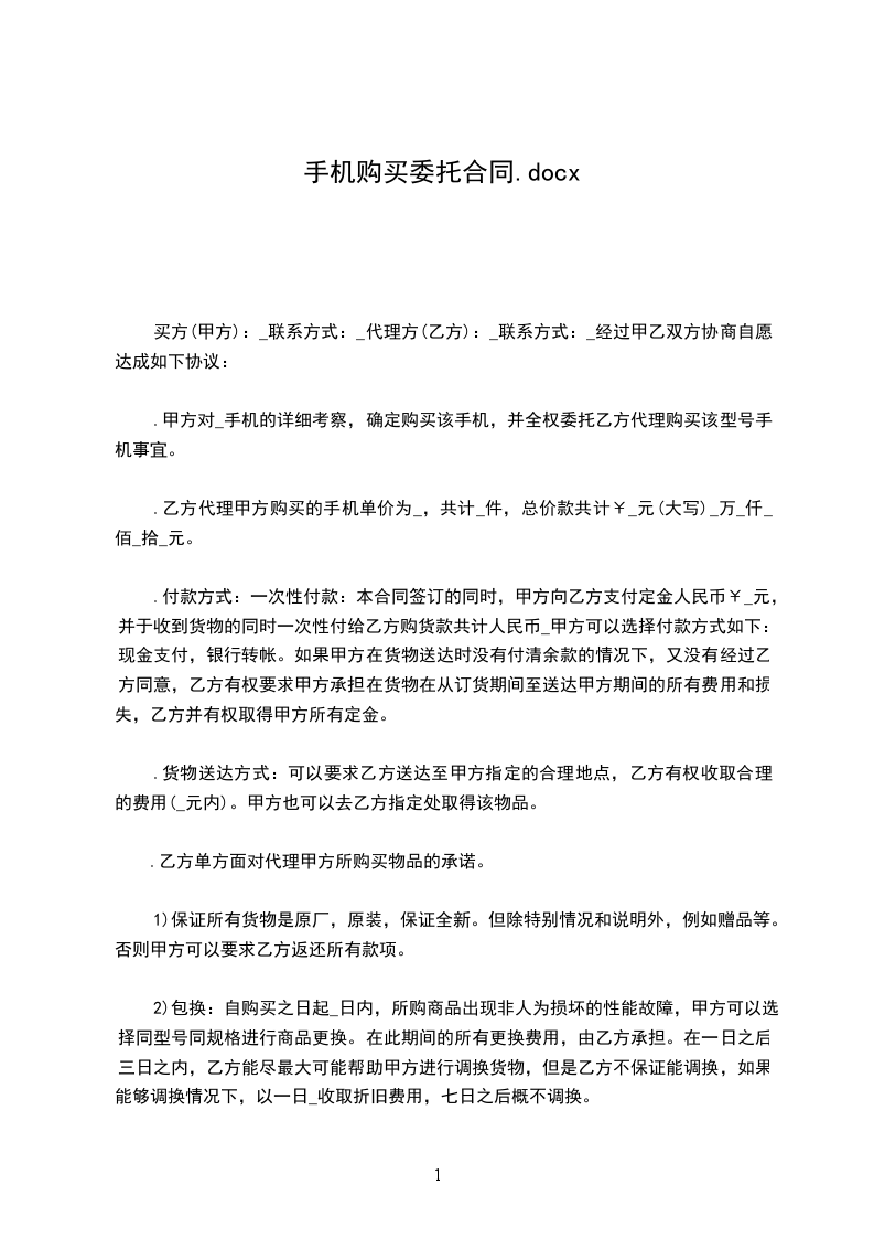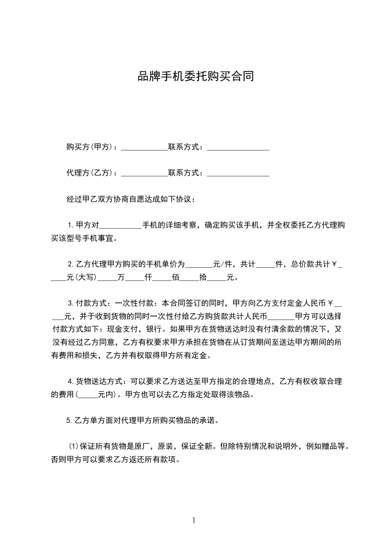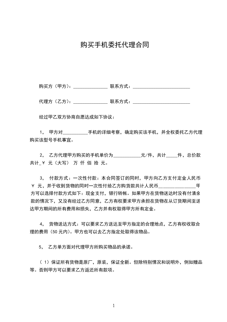 1, 甲方对___________手机的详细考察,确定购买该手机,并全权委托乙方代理购买该型号手机事宜。