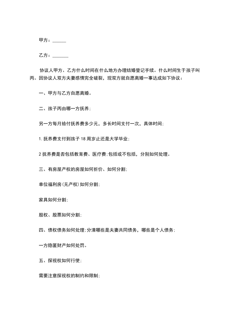 协议人甲方、乙方什么时间在什么地方办理结婚登记手续。什么时间生于孩子叫丙。因协议人双方夫妻感情完全破裂,现双方就自愿离婚一事达成如下协议: