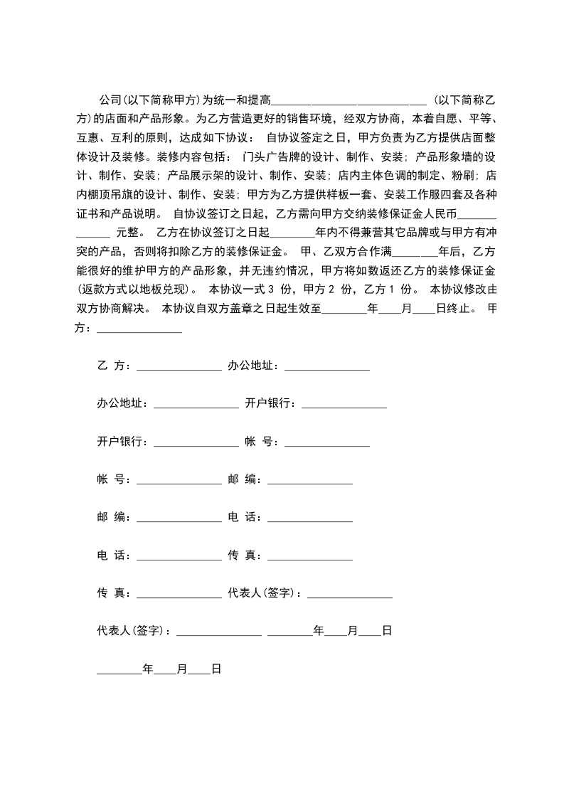 公司(以下简称甲方)为统一和提高___________________________ (以下简称乙方)的店面和产品形象。为乙方营造更好的销售环境,经双方协商,本着自愿、平等、互惠、互利的原则,达成如下协议: 自协议签定之日,甲方负责为乙方提供店面整体设计及装修。装修内容包括: 门头广告牌的设计、制作、安装; 产品形象墙的设计、制作、安装; 产品展示架的设计、制作、安装; 店内主体色调的制定、粉刷; 店内棚顶吊旗的设计、制作、安装; 甲方为乙方提供样板一套、安装工作服四套及各种证书和产品说明。 自协议签订之日起,乙方需向甲方交纳装修保证金人民币_____________ 元整。 乙方在协议签订之日起________年内不得兼营其它品牌或与甲方有冲突的产品,否则将扣除乙方的装修保证金。 甲、乙双方合作满________年后,乙方能很好的维护甲方的产品形象,并无违约情况,甲方将如数返还乙方的装修保证金(返款方式以地板兑现)。 本协议一式3 份,甲方2 份,乙方1 份。 本协议修改由双方协商解决。 本协议自双方盖章之日起生效至________年____月____日终止。 甲方:_______________