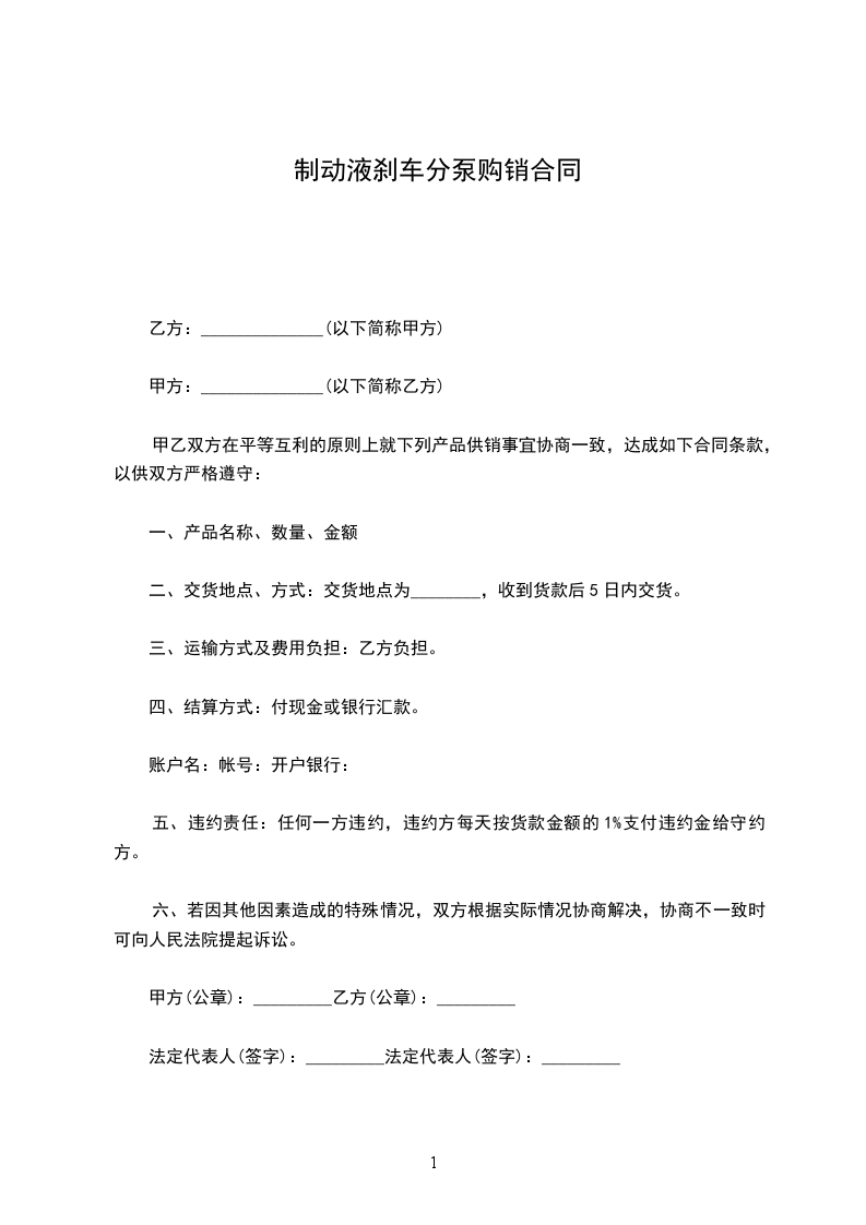五、违约责任:任何一方违约,违约方每天按货款金额的1%支付违约金给守约方。