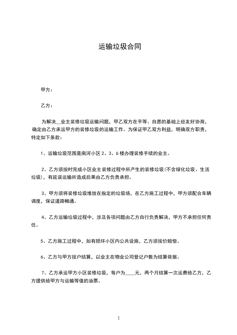 1、费用:本协议下的生活垃圾清X费为 元月(大写:币 元整月)。