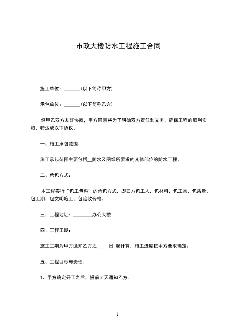 经甲方对乙方承建专业资格的考核,同意将公司_________防水工程委托乙方施工,为了明确双方在施工过程中的权利、义务和责任,按照确保工程质量、工程进度、工程安全的原则,协商确定如下合同条款共同遵守执行。