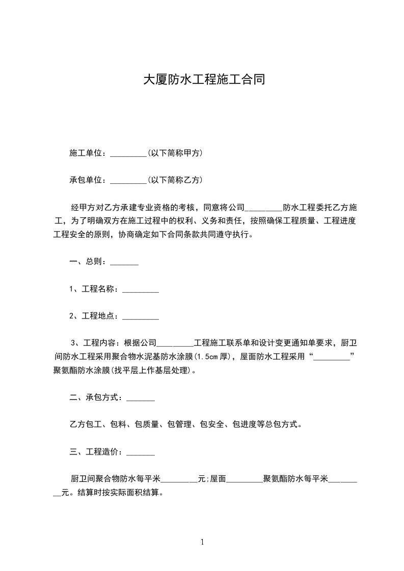 厨卫间聚合物防水每平米_________元;屋面_________聚氨酯防水每平米_________元。结算时按实际面积结算。