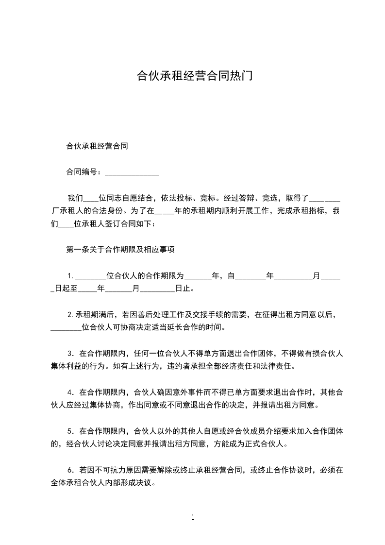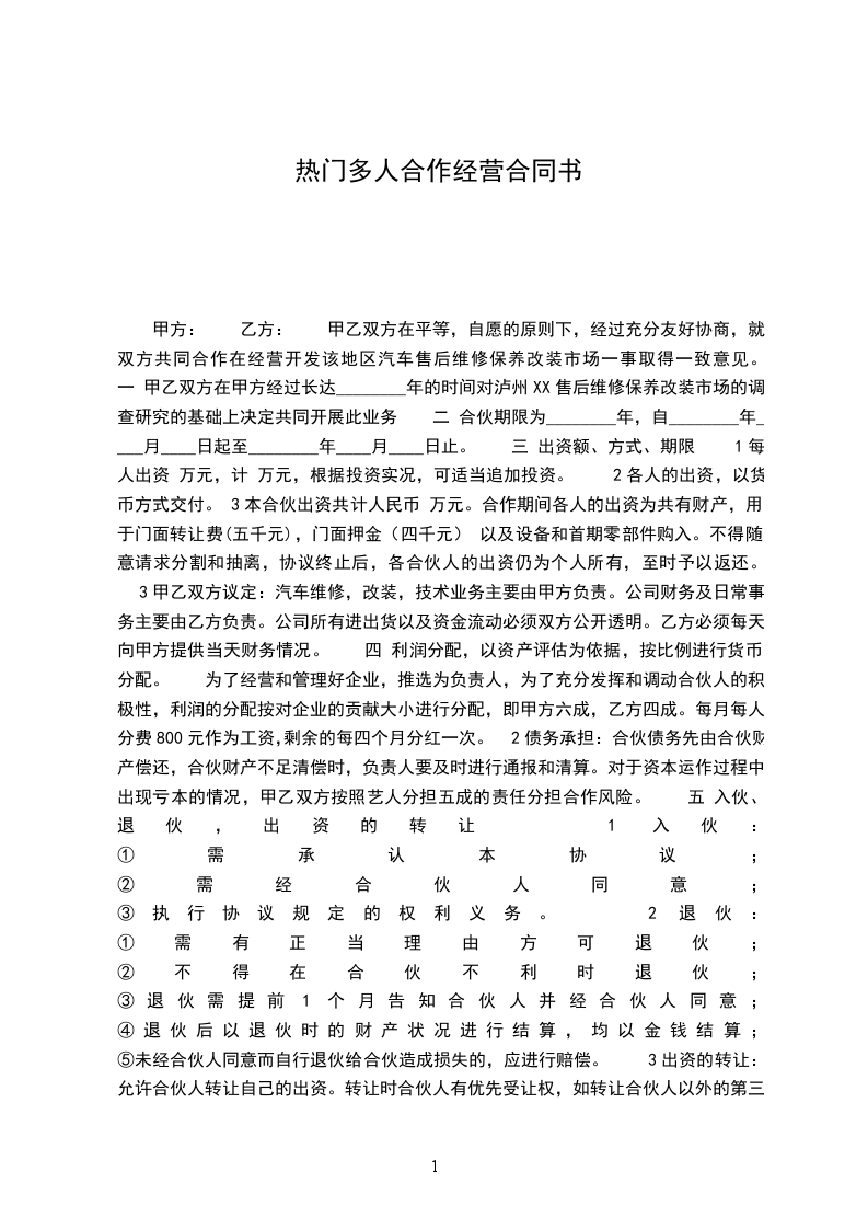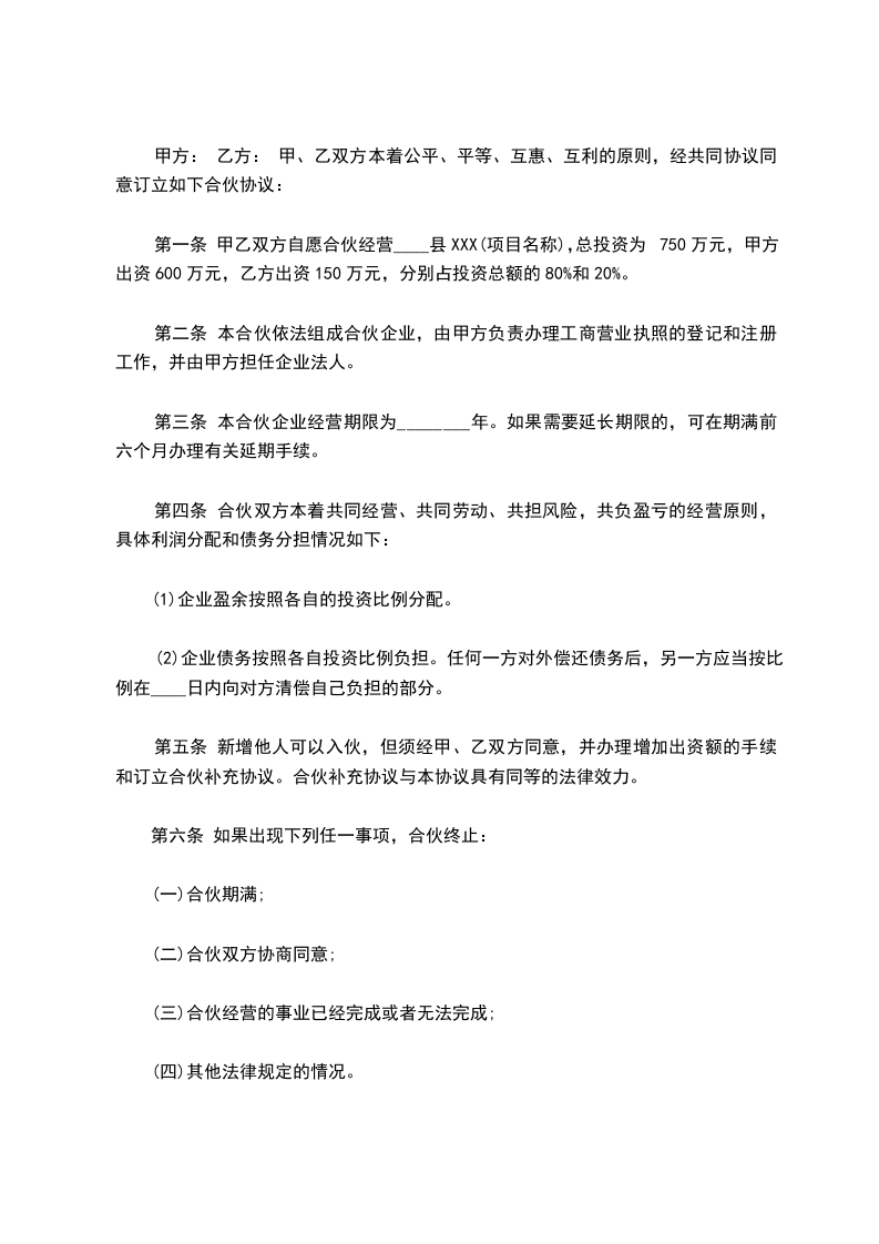 甲方: 乙方: 甲乙双方在平等,自愿的原则下,经过充分友好协商,就双方共同合作在经营开发该地区汽车售后维修保养改装市场一事取得一致意见。 一 甲乙双方在甲方经过长达________年的时间对泸州XX售后维修保养改装市场的调查研究的基础上决定共同开展此业务 二 合伙期限为________年,自________年____月____日起至________年____月____日止。 三 出资额、方式、期限 1每人出资 万元,计 万元,根据投资实况,可适当追加投资。 2各人的出资,以货币方式交付。 3本合伙出资共计人民币 万元。合作期间各人的出资为共有财产,用于门面转让费(五千元),门面押金(四千元) 以及设备和首期零部件购入。不得随意请求分割和抽离,协议终止后,各合伙人的出资仍为个人所有,至时予以返还。 3甲乙双方议定:汽车维修,改装,技术业务主要由甲方负责。公司财务及日常事务主要由乙方负责。公司所有进出货以及资金流动必须双方公开透明。乙方必须每天向甲方提供当天财务情况。 四 利润分配,以资产评估为依据,按比例进行货币分配。 为了经营和管理好企业,推选为负责人,为了充分发挥和调动合伙人的积极性,利润的分配按对企业的贡献大小进行分配,即甲方六成,乙方四成。每月每人分费800元作为工资,剩余的每四个月分红一次。 2债务承担:合伙债务先由合伙财产偿还,合伙财产不足清偿时,负责人要及时进行通报和清算。对于资本运作过程中出现亏本的情况,甲乙双方按照艺人分担五成的责任分担合作风险。 五 入伙、退伙,出资的转让 1入伙: