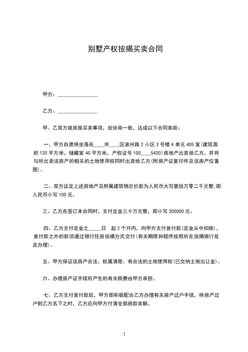 一、甲方自愿将坐落在____市____区渝州路2小区3号楼4单元405室(建筑面积120平方米,储藏室40平方米,产权证号100____5420)房地产出卖给乙方,并将与所出卖该房产的相关的土地使用权同时出卖给乙方(附房产证复印件及该房产位置图)。