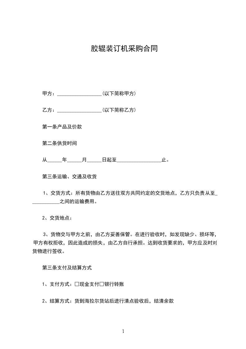 1、交货方式:所有货物由乙方送往双方共同约定的交货地点,乙方只负责从至____________之间的运输费用。