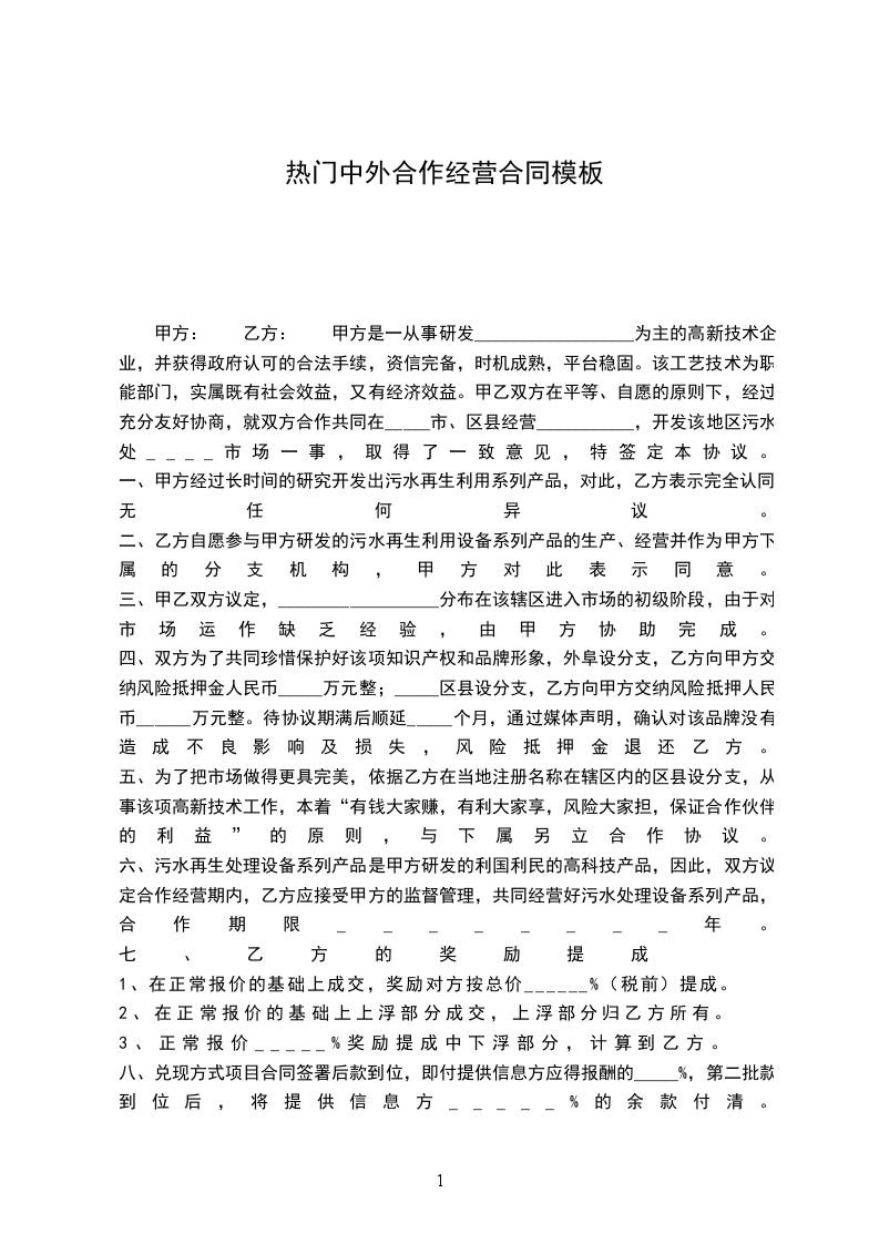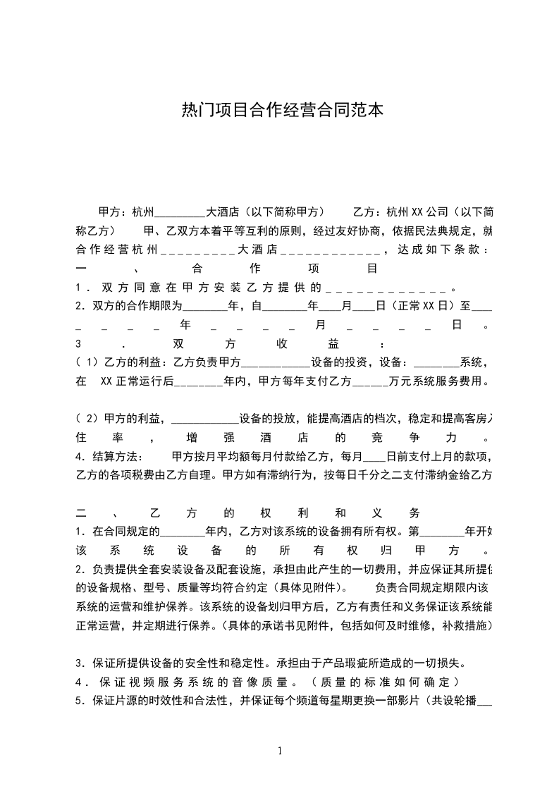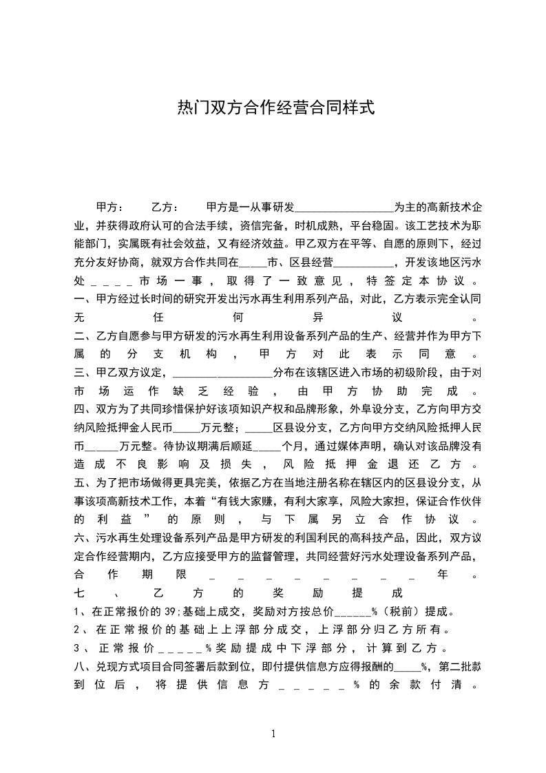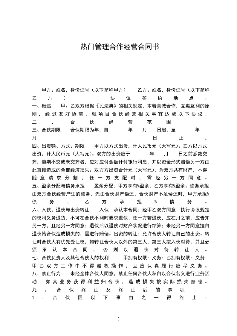 甲方: 乙方: 甲、乙双方本着公平、平等、互惠、互利的原则,经共同协议同意订立如下合伙协议: