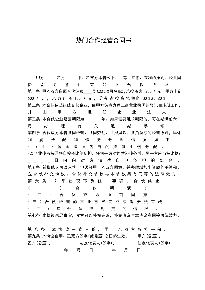 第一条 甲乙双方自愿合伙经营____县XXX(项目名称),总投资为750万元,甲方出资600万元,乙方出资150万元,分别占投资总额的80%和20%。