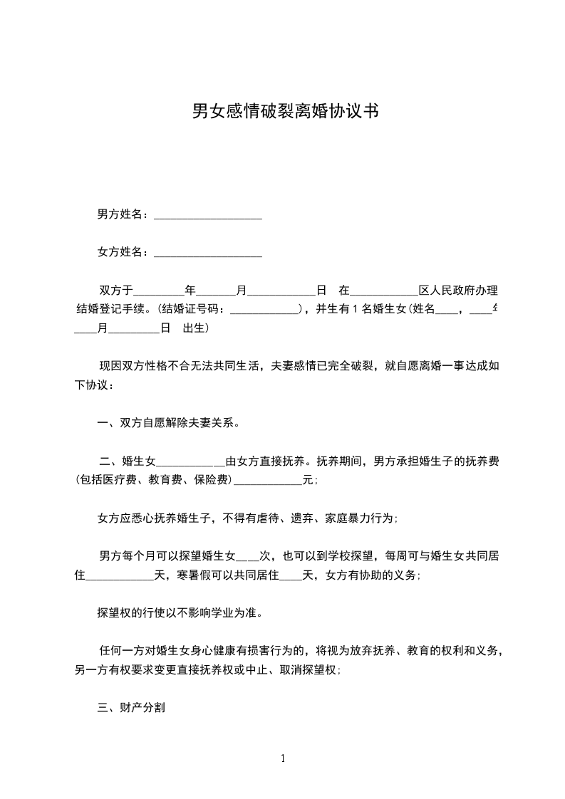 现因双方性格不合无法共同生活,夫妻感情已完全破裂,就自愿离婚一事达成如下协议: