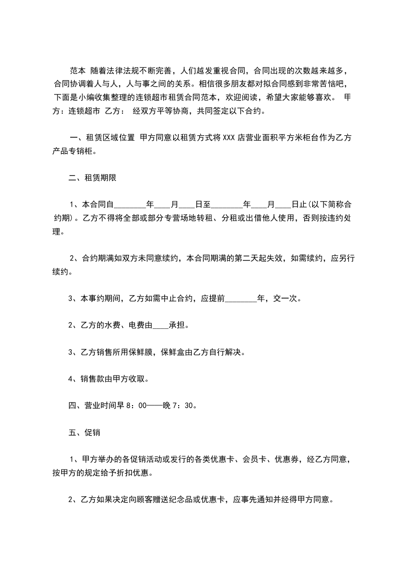 范本 随着法律法规不断完善,人们越发重视合同,合同出现的次数越来越多,合同协调着人与人,人与事之间的关系。相信很多朋友都对拟合同感到非常苦恼吧,下面是小编收集整理的连锁超市租赁合同范本,欢迎阅读,希望大家能够喜欢。 甲方:连锁超市 乙方: 经双方平等协商,共同签定以下合约。