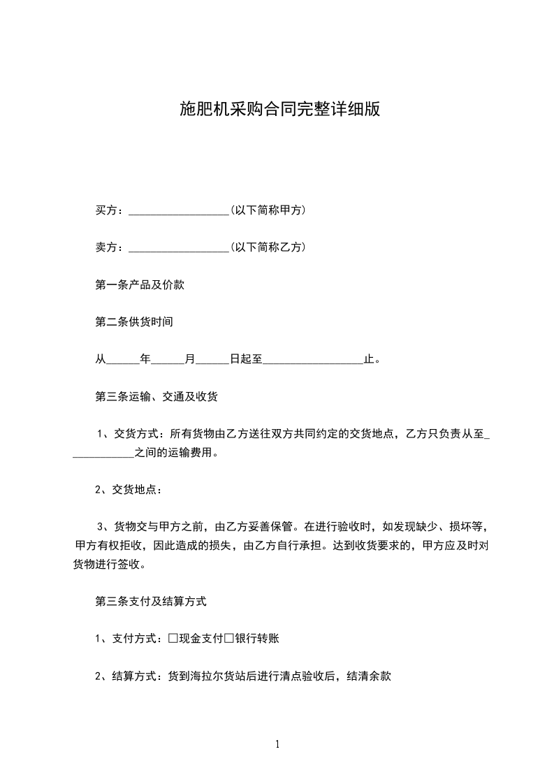 1、交货方式:所有货物由乙方送往双方共同约定的交货地点,乙方只负责从至____________之间的运输费用。