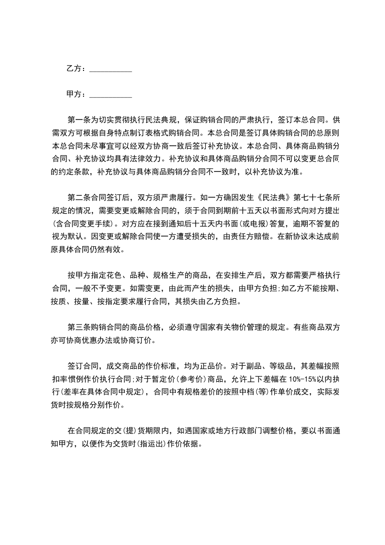 第一条为切实贯彻执行民法典规,保证购销合同的严肃执行,签订本总合同。供需双方可根据自身特点制订表格式购销合同。本总合同是签订具体购销合同的总原则。本总合同未尽事宜可以经双方协商一致后签订补充协议。本总合同、具体商品购销分合同、补充协议均具有法律效力。补充协议和具体商品购销分合同不可以变更总合同的约定条款,补充协议与具体商品购销分合同不一致时,以补充协议为准。