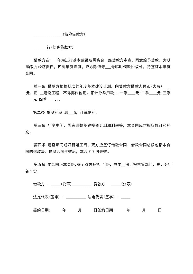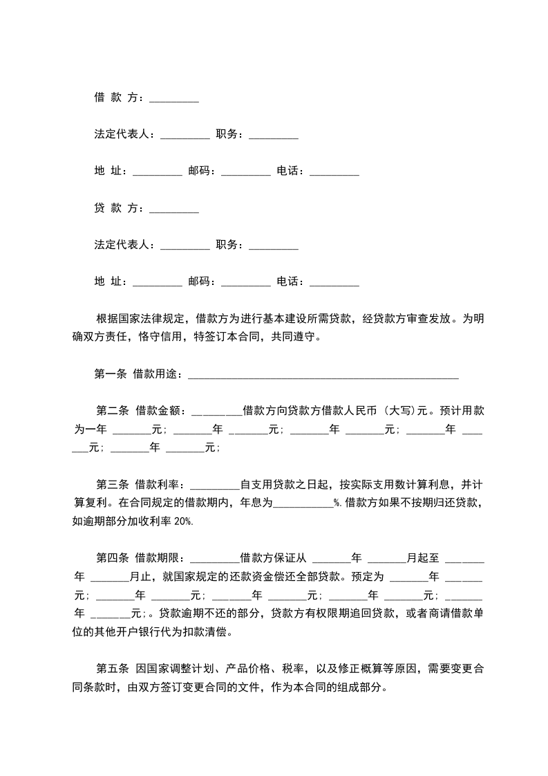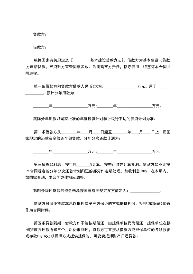 根据国家有关规定及《_________基本建设贷款办法》,借款方为基本建设向贷款方申请贷款,经贷款方审查同意发放。为明确双方责任,恪守信用,特签订本合同共同遵守。