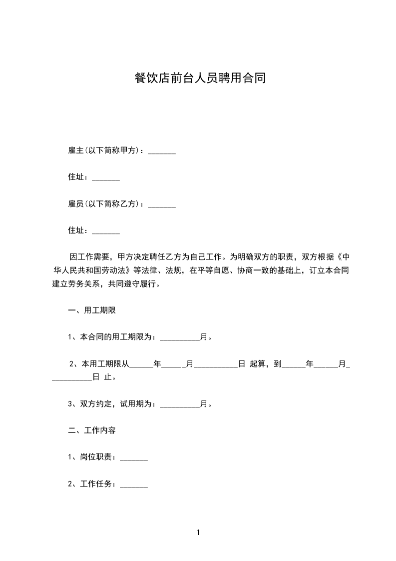 1、本合同的用工期限为:__________月。