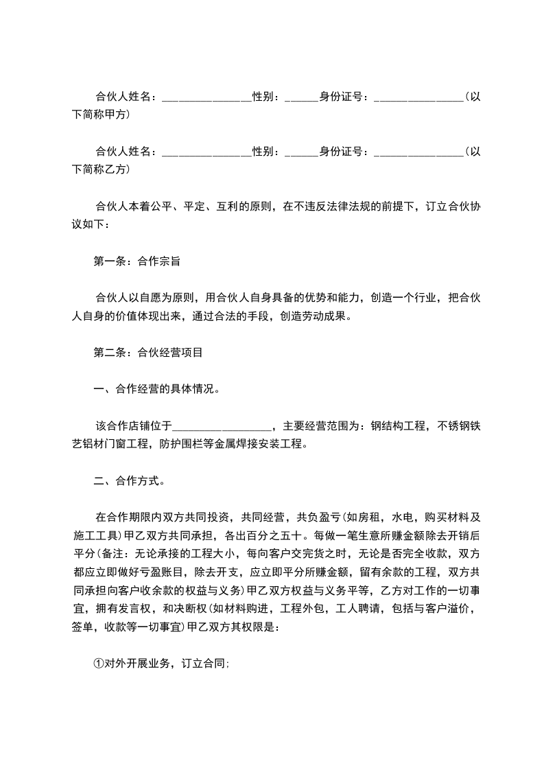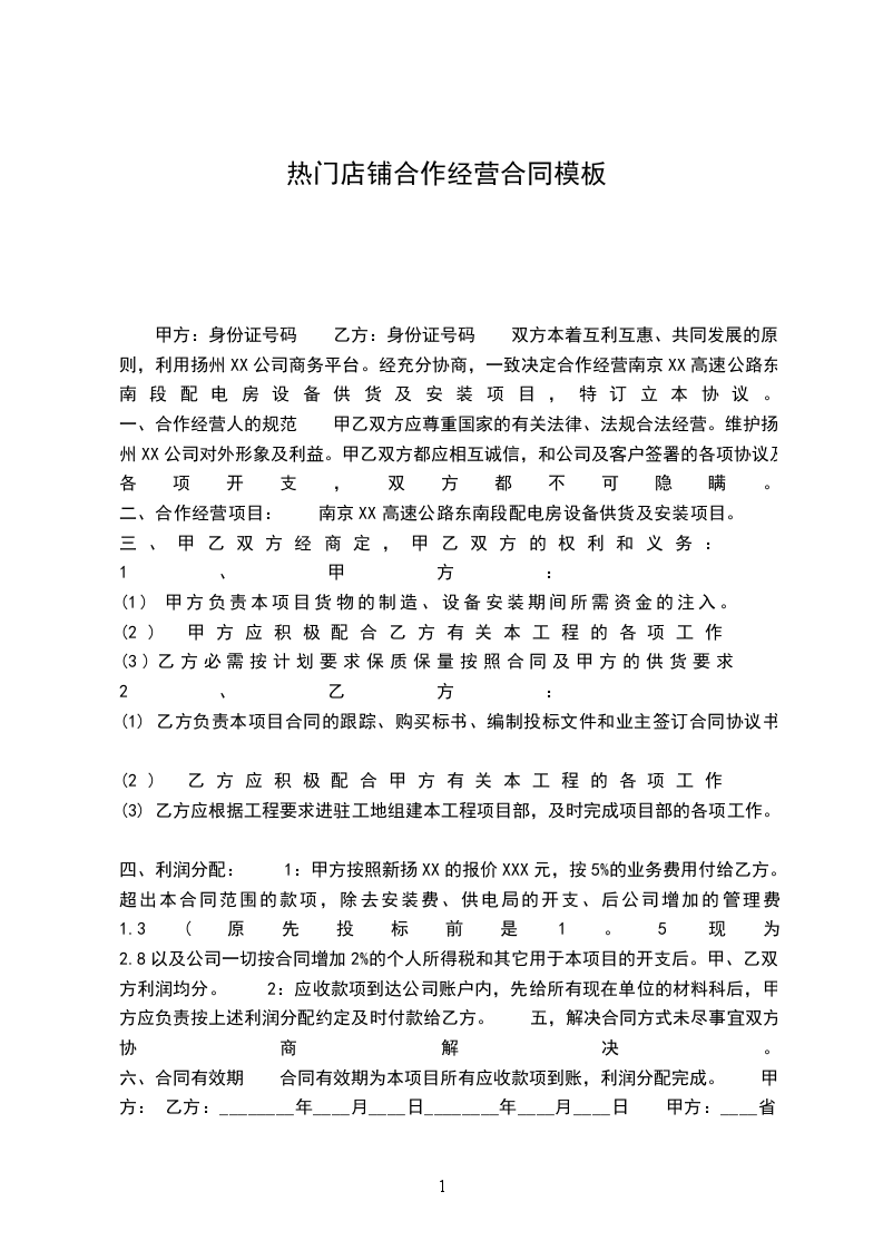 甲方:身份证号码 乙方:身份证号码 双方本着互利互惠、共同发展的原则,利用扬州XX公司商务平台。经充分协商,一致决定合作经营南京XX高速公路东南段配电房设备供货及安装项目,特订立本协议。