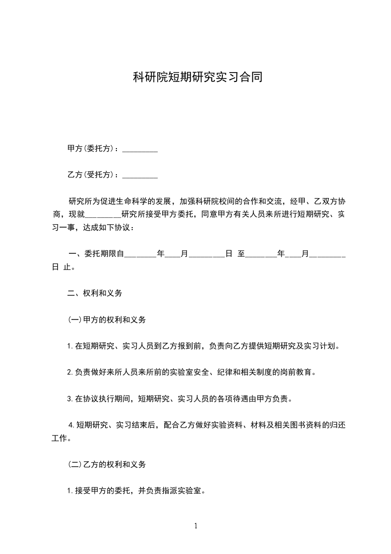 研究所为促进生命科学的发展,加强科研院校间的合作和交流,经甲、乙双方协商,现就_________研究所接受甲方委托,同意甲方有关人员来所进行短期研究、实习一事,达成如下协议: