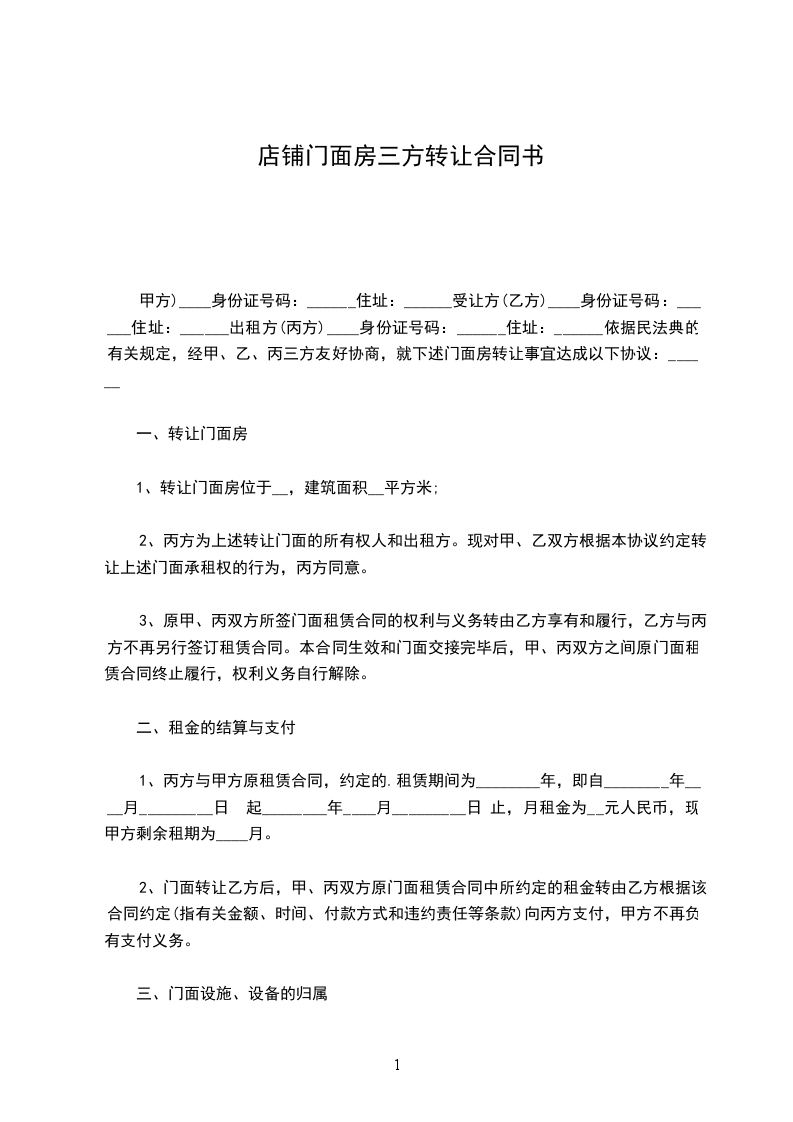 甲方)____身份证号码:______住址:______受让方(乙方)____身份证号码:______住址:______出租方(丙方)____身份证号码:______住址:______依据民法典的有关规定,经甲、乙、丙三方友好协商,就下述门面房转让事宜达成以下协议:______