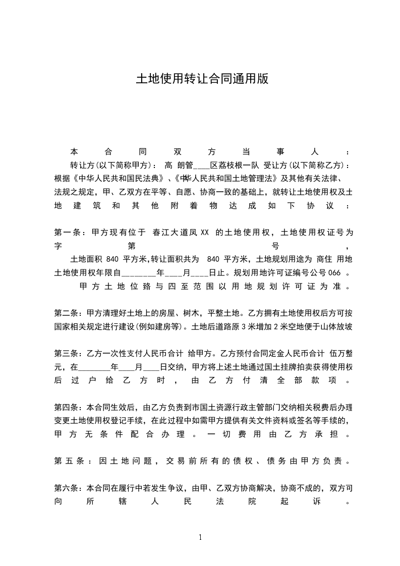 土地面积 840 平方米,转让面积共为 840 平方米,土地规划用途为 商住 用地,土地使用权年限自________年____月____日止。规划用地许可证编号公号066 。