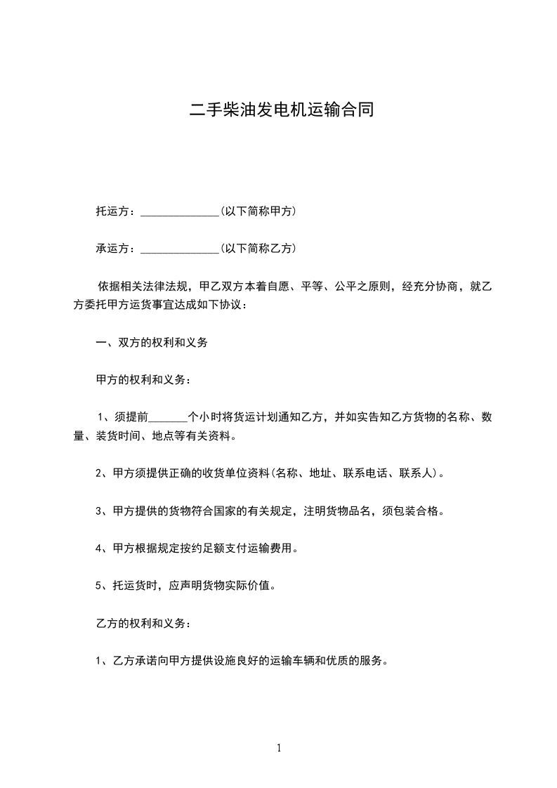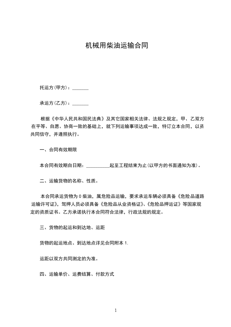 根据《中华人民共和国民法典》及其它国家相关法律、法规之规定,甲、乙双方在平等、自愿、协商一致的基础上,就下列运输事项达成一致,特订立本合同,以资共同信守,并遵照执行。