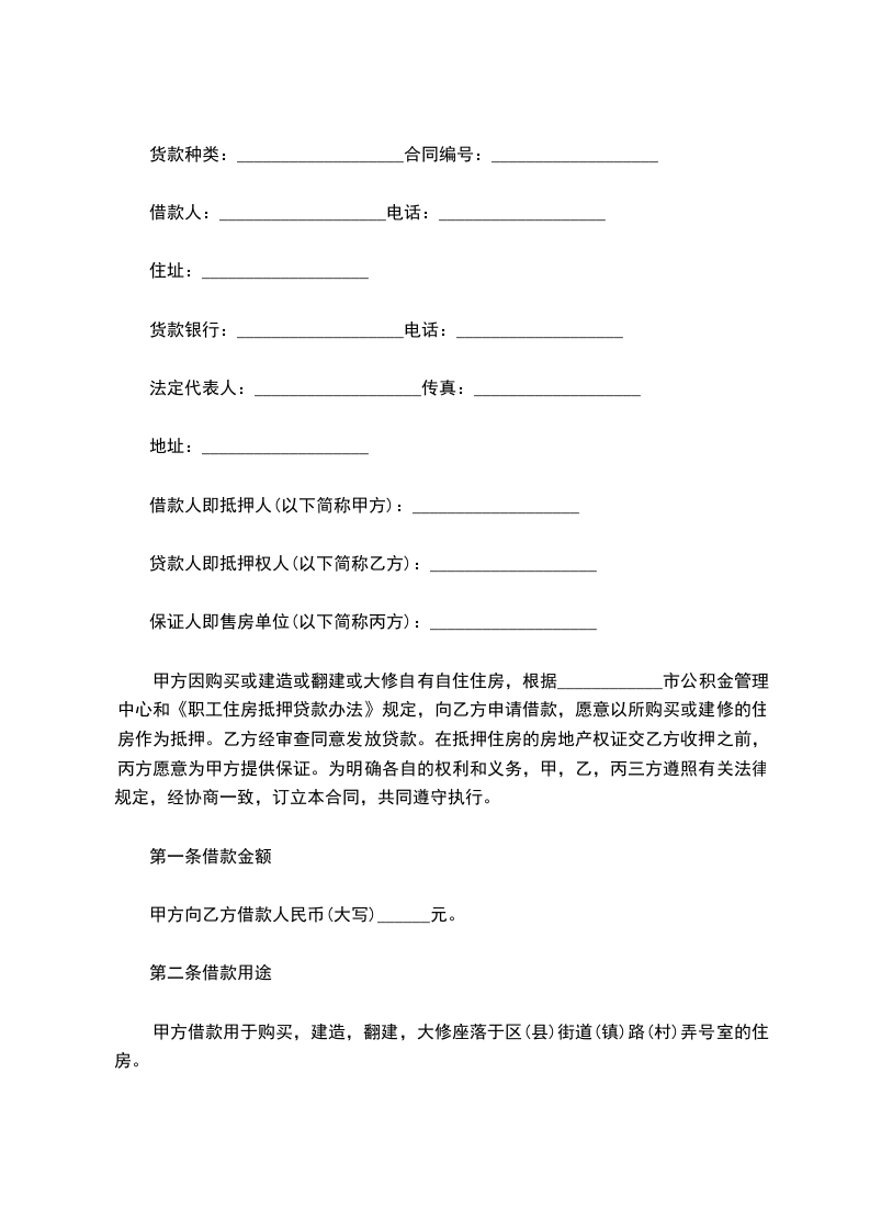 甲方因购买或建造或翻建或大修自有自住住房,根据____________市公积金管理中心和《职工住房抵押贷款办法》规定,向乙方申请借款,愿意以所购买或建修的住房作为抵押。乙方经审查同意发放贷款。在抵押住房的房地产权证交乙方收押之前,丙方愿意为甲方提供保证。为明确各自的权利和义务,甲,乙,丙三方遵照有关法律规定,经协商一致,订立本合同,共同遵守执行。