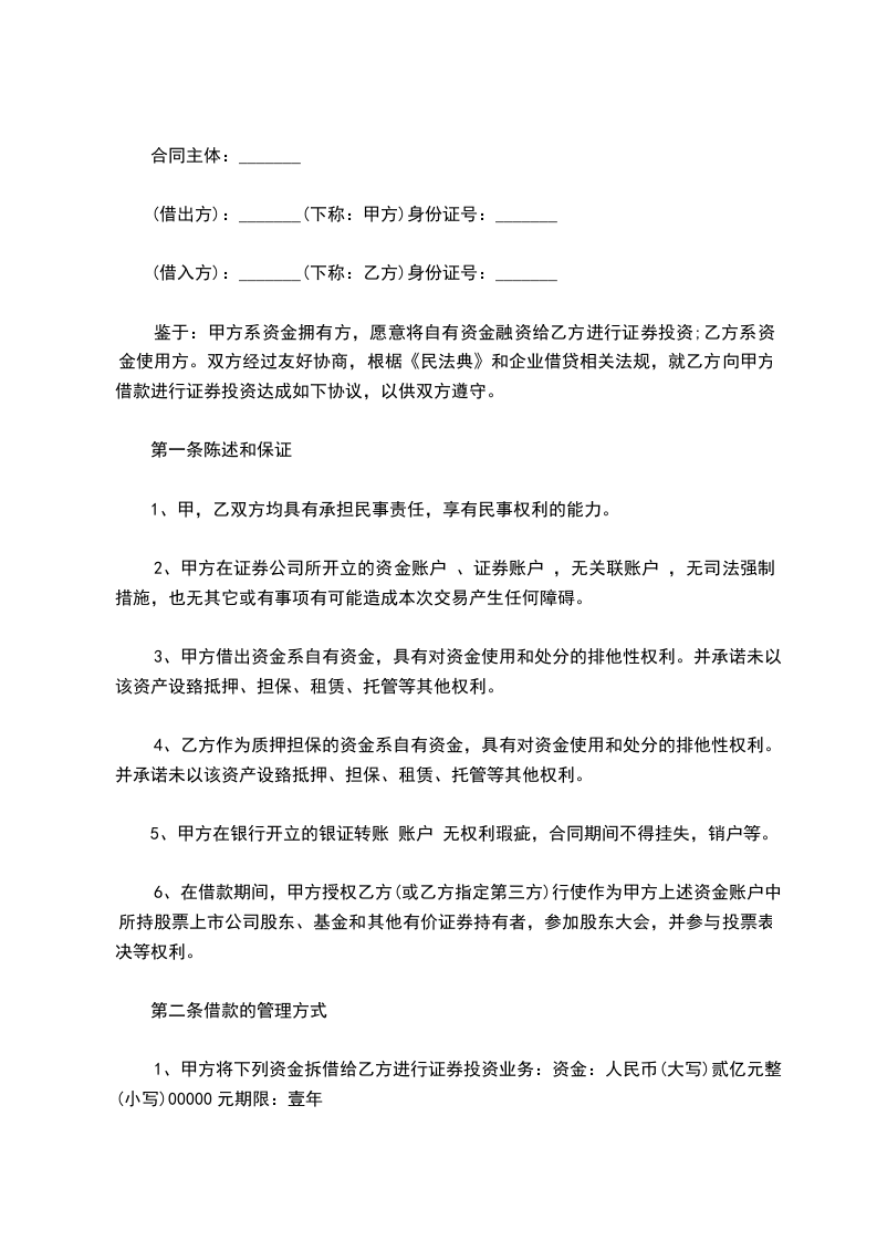 鉴于:甲方系资金拥有方,愿意将自有资金融资给乙方进行证券投资;乙方系资金使用方。双方经过友好协商,根椐《民法典》和企业借贷相关法规,就乙方向甲方借款进行证券投资达成如下协议,以供双方遵守。