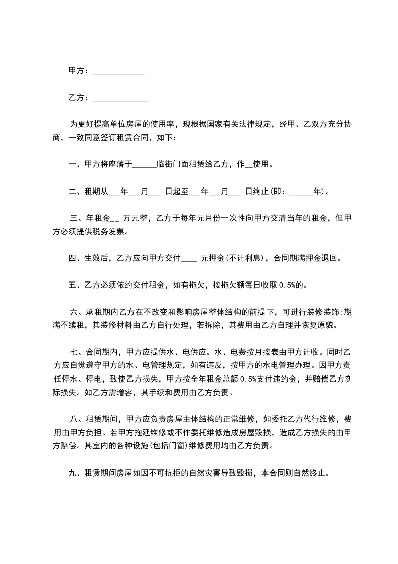 1.双方商定房屋租期为______年,:自____年____月__________日 起至________年_____月__________日 止。经甲方向乙方移交房屋钥匙后视为交付完成。