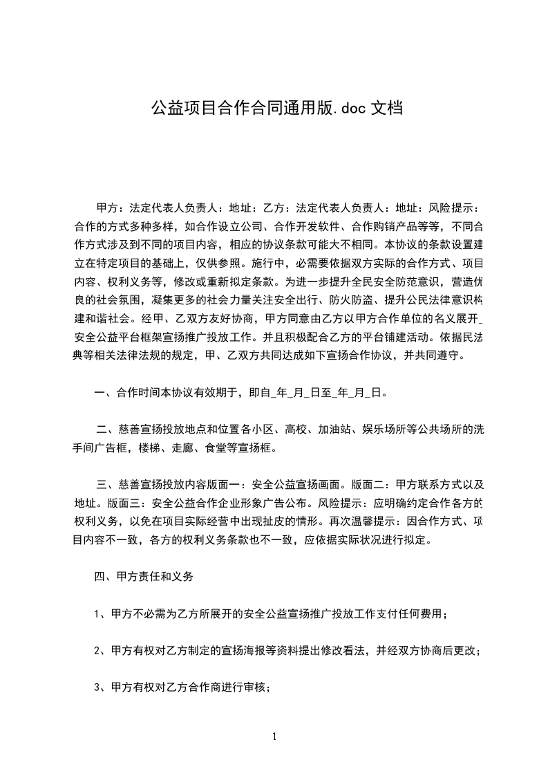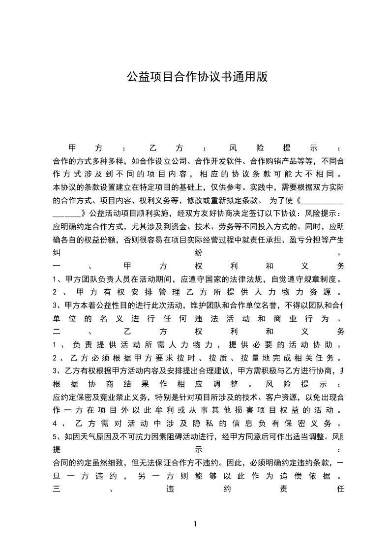 本协议的条款设置建立在特定项目的基础上,仅供参考。实践中,需要根据双方实际的合作方式、项目内容、权利义务等,修改或重新拟定条款。 为了使《__________________》公益活动项目顺利实施,经双方友好协商决定签订以下协议:风险提示: