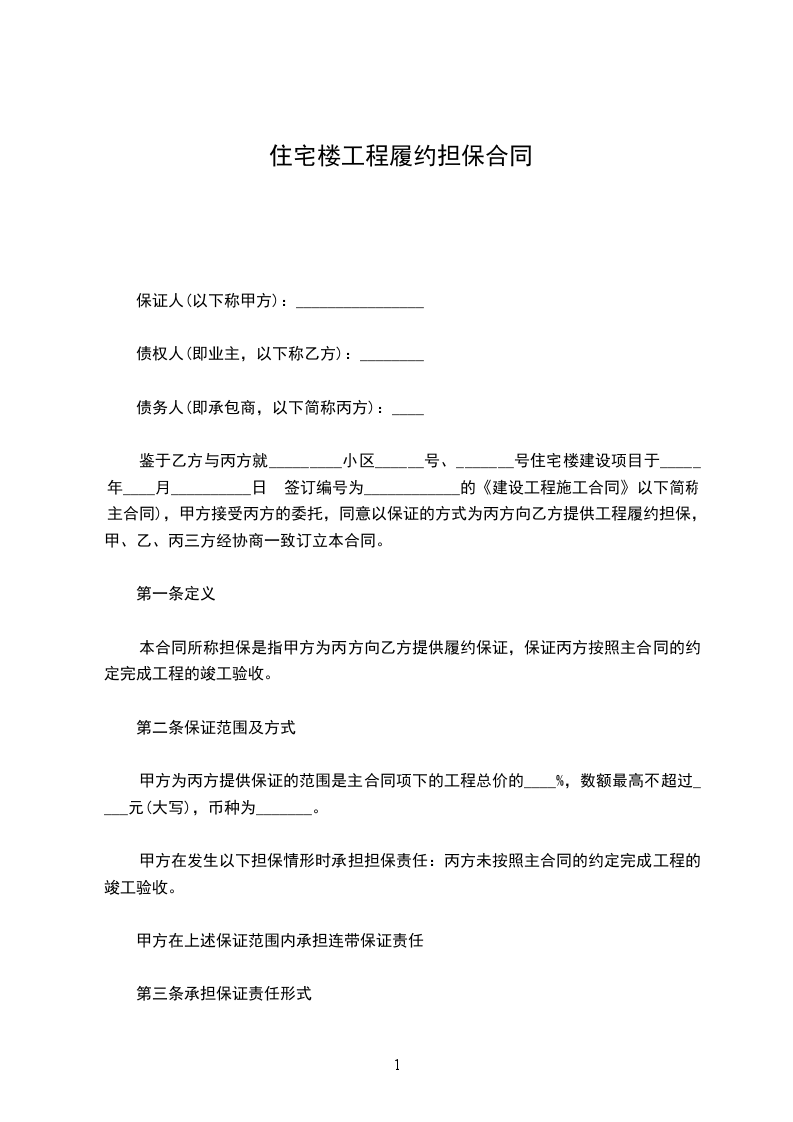 鉴于乙方与丙方就_________小区______号、_______号住宅楼建设项目于_____年____月__________日 签订编号为____________的《建设工程施工合同》以下简称主合同),甲方接受丙方的委托,同意以保证的方式为丙方向乙方提供工程履约担保,甲、乙、丙三方经协商一致订立本合同。