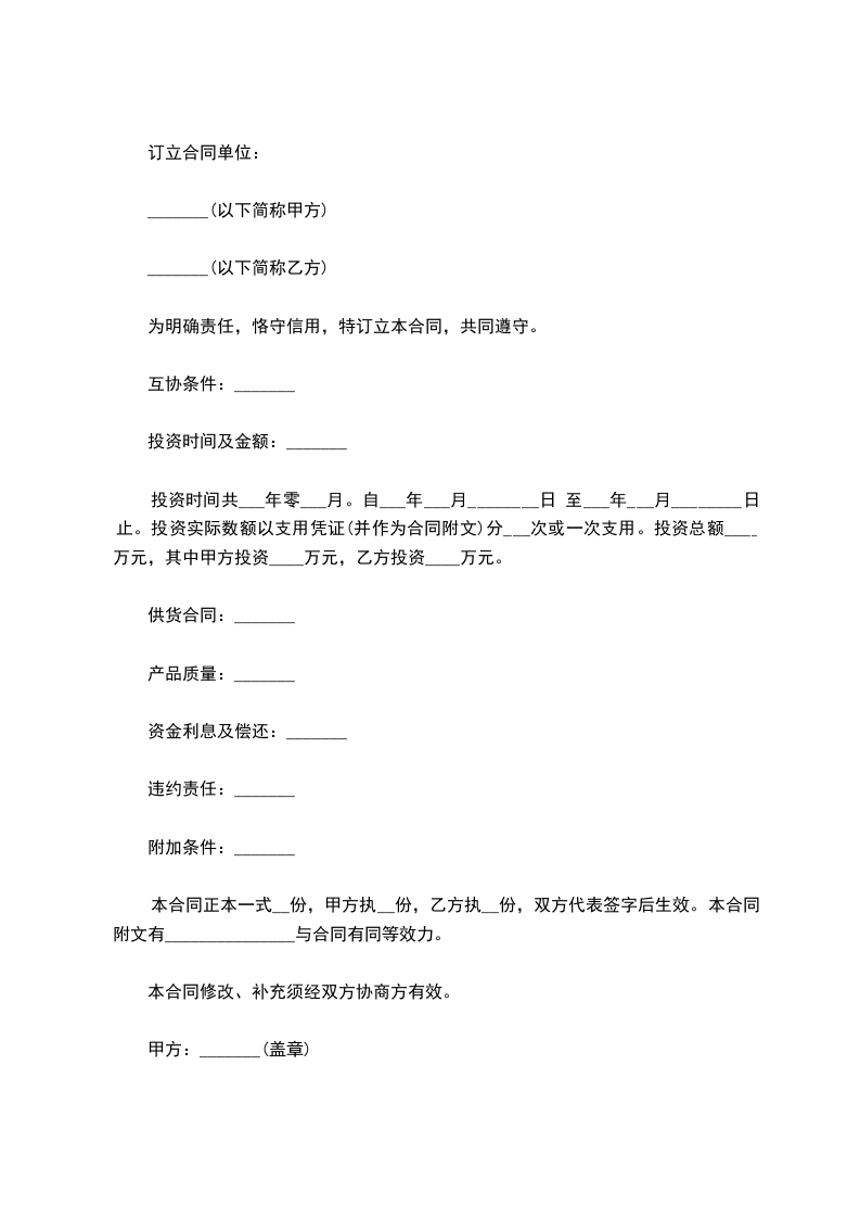 投资时间共___年零___月。自___年___月________日 至___年___月________日 止。投资实际数额以支用凭证(并作为合同附文)分___次或一次支用。投资总额____万元,其中甲方投资____万元,乙方投资____万元。