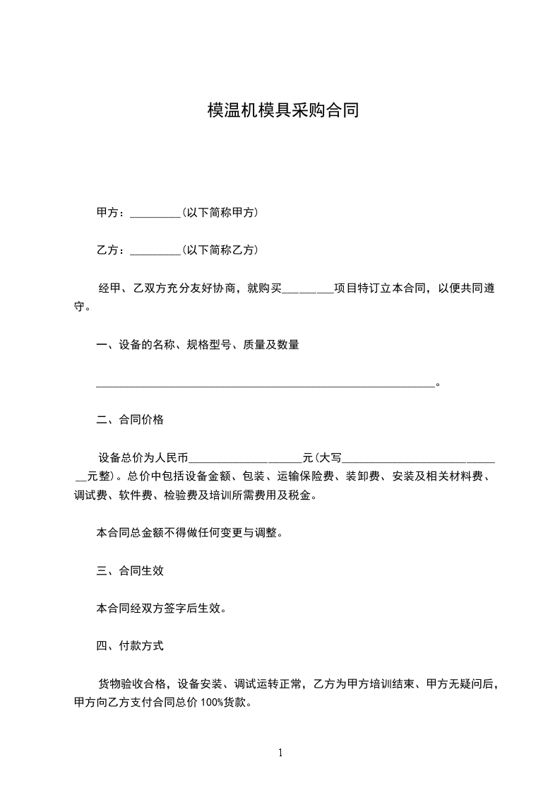 设备总价为人民币____________________元(大写_____________________________元整)。总价中包括设备金额、包装、运输保险费、装卸费、安装及相关材料费、调试费、软件费、检验费及培训所需费用及税金。