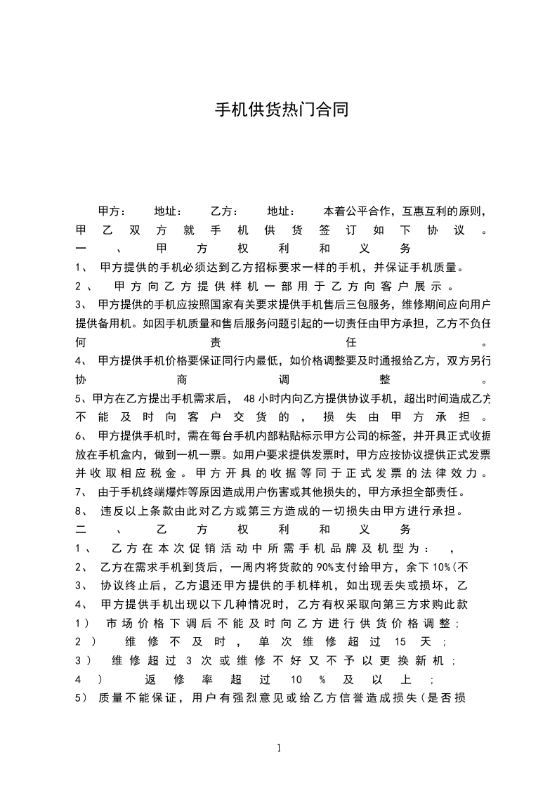 甲方: 地址: 乙方: 地址: 本着公平合作,互惠互利的原则,甲乙双方就手机供货签订如下协议。