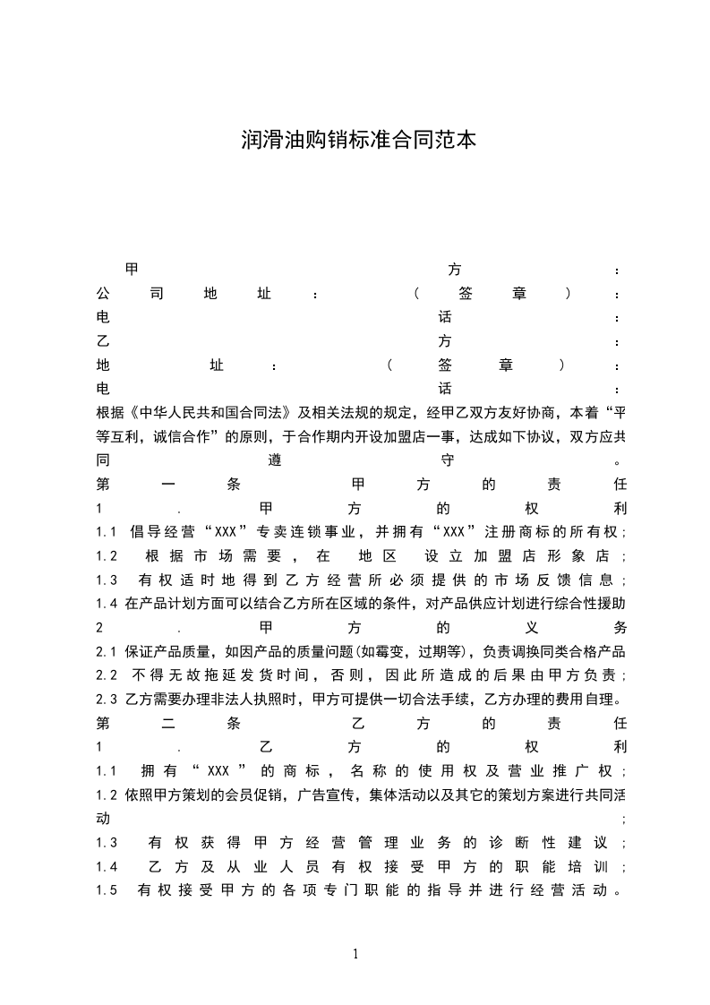 1.有关甲方的说明:“ 公司”是甲方的公司名称,“XXX”是甲方的专卖店品牌名称。