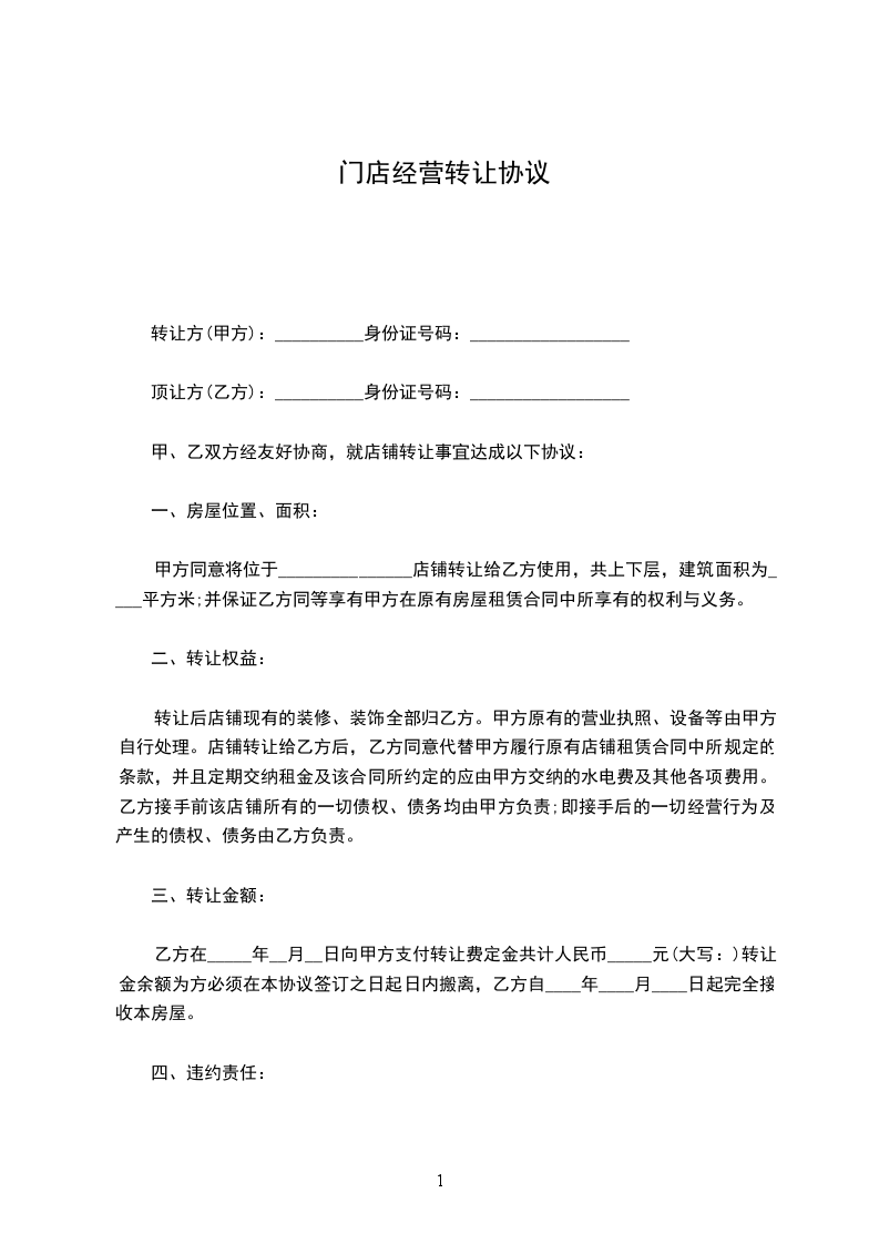 转让方(甲方): 身份证号: 顶让方(乙方): 身份证号: 甲、乙、两方经友好协商,就店铺转让事宜达成以下协议: