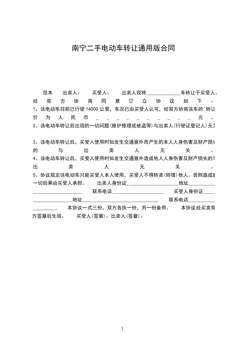 1、该电动车目前已行驶14000公里,车况已由买受人认可,经双方协商该车的`转让价为人民币__________元。