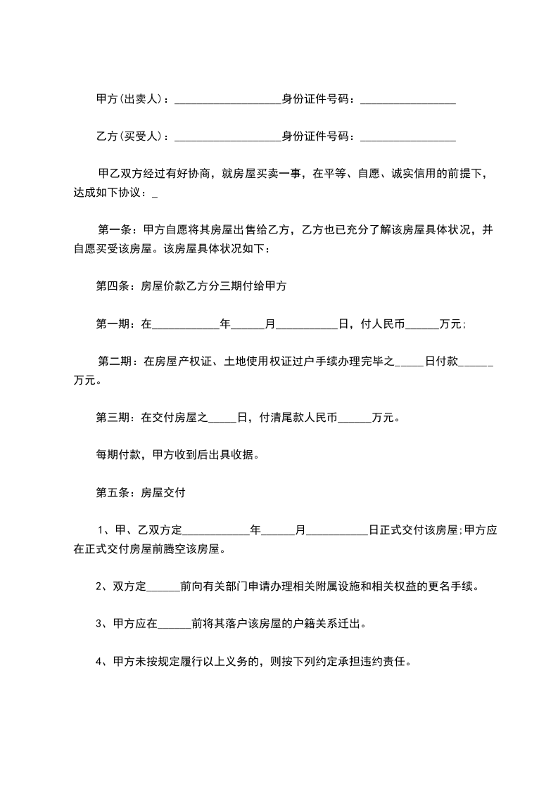 2、甲方应在房屋交付前__________日前将原落户该房屋的所有户籍关系迁出,交付房屋后,甲方配合乙方户籍迁入等手续。