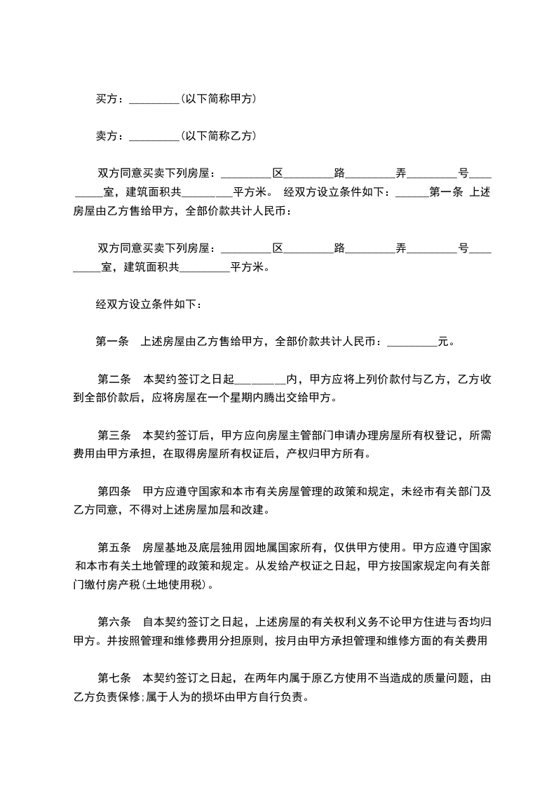 1、甲、乙双方协商一致,甲方所售房屋总金额为(人民币)___拾___万___仟___佰元整(含附属设施费用);