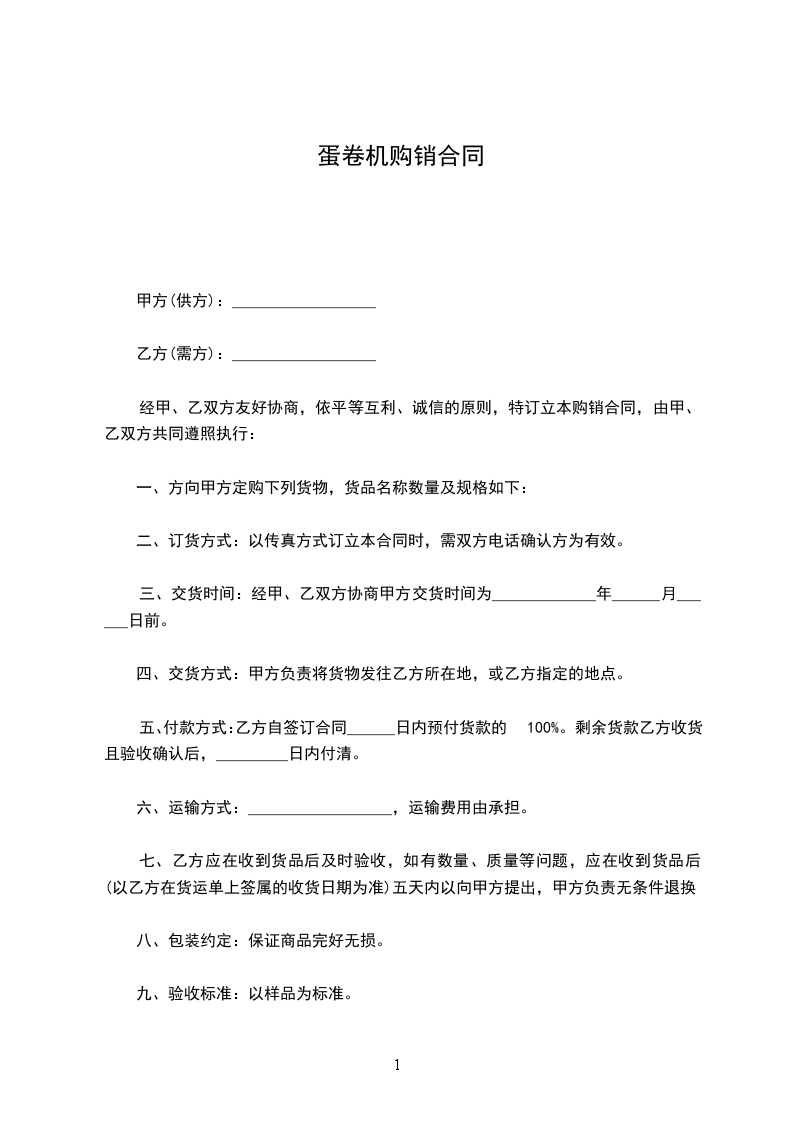 五、付款方式:乙方自签订合同______日内预付货款的100%。剩余货款乙方收货且验收确认后,_________日内付清。
