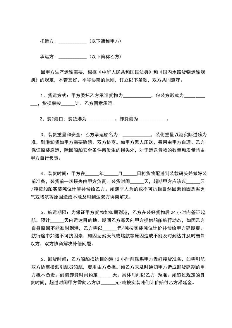 七 、双方合作的的运费结算方式为月结30天。当月发生的运费须在此月____日前核对完毕并由乙方开具运输发票给甲方。甲方收到乙方发票后{接受日期以发票签收日为准}的次月____日之前将相关费用支付到乙方指定账户。若甲方未在规定时间将运费支付给乙方,则甲方每天按运费总额的千分之二向乙方支付滞纳金。