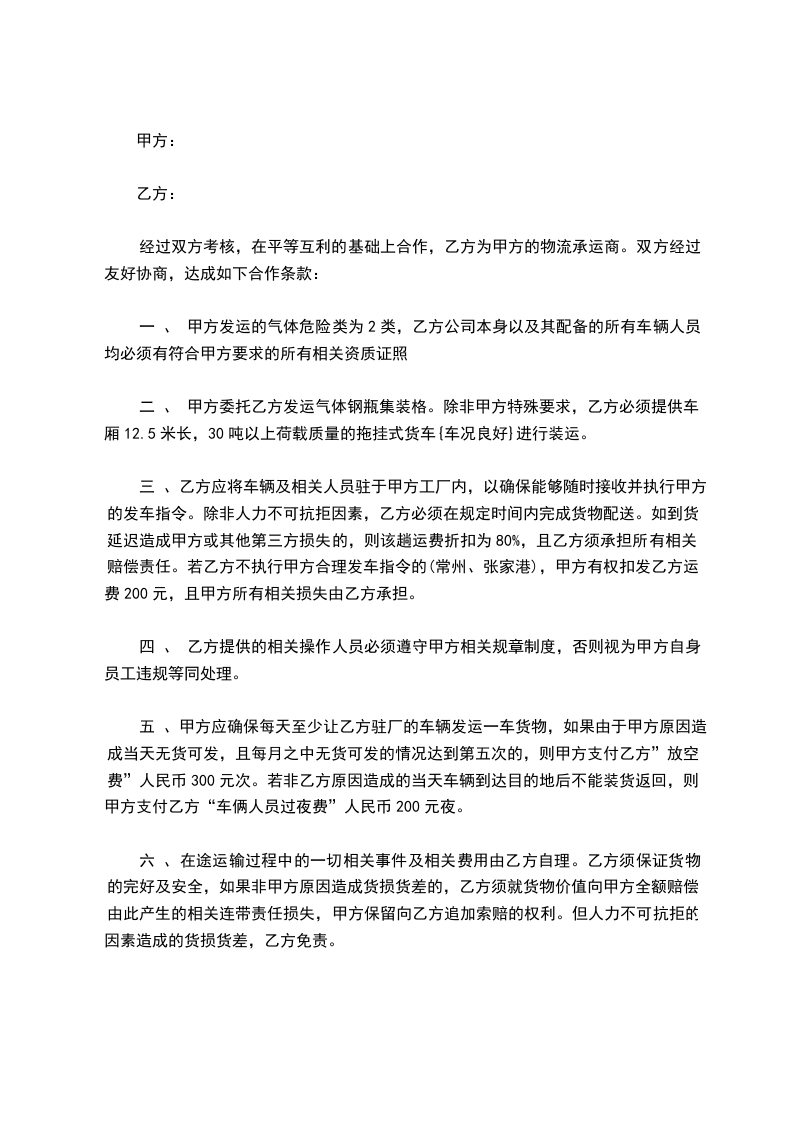 经过双方考核,在平等互利的基础上合作,乙方为甲方的物流承运商。双方经过友好协商,达成如下合作条款: