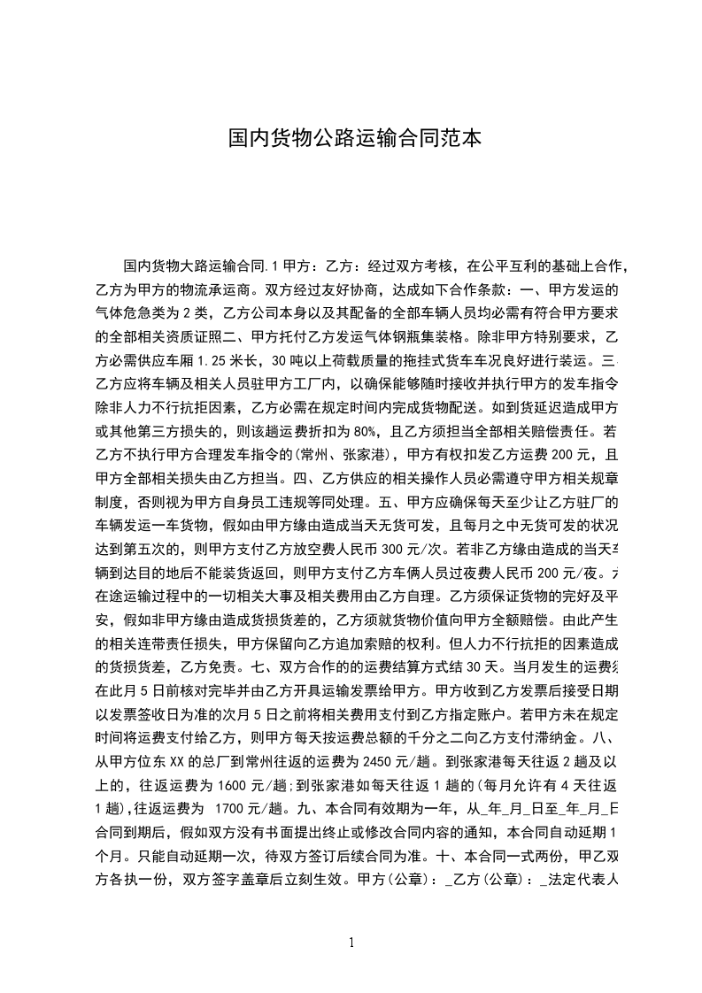 八、从甲方位于东XX的总厂到常州往返的运费为2450元趟。到张家港每天往返2趟及以上的,往返运费为1600元趟;到张家港如每天往返1趟的(每月允许有4天往返1趟),往返运费为1700元趟。