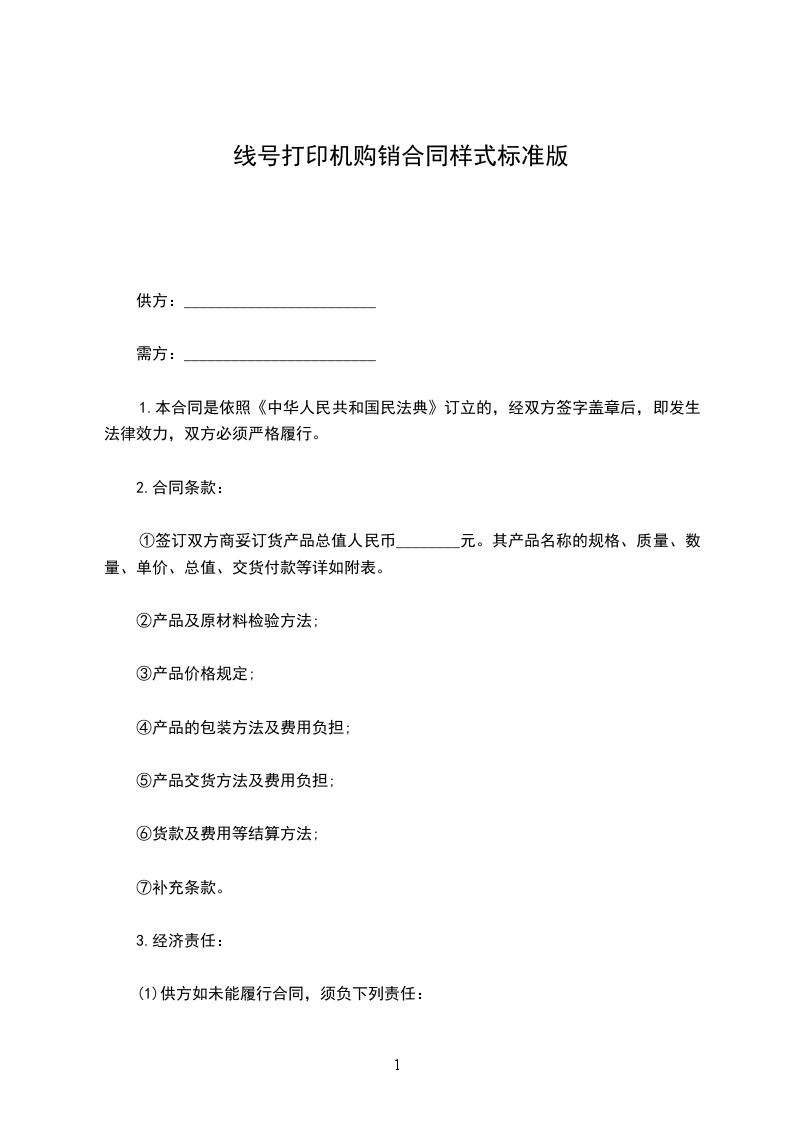 (5)如因生产原料、生产设备、生产工艺或市场发生重大变化,需要变更产品品种、花色、规格、质量、包装时,应提前____天与对方协商修订调整,并报鉴证机关备案,任何一方不得擅自变更合同。一方变更合同,对方有权拒绝收购,因此而不能执行合同应偿付对方千分之______的罚金。