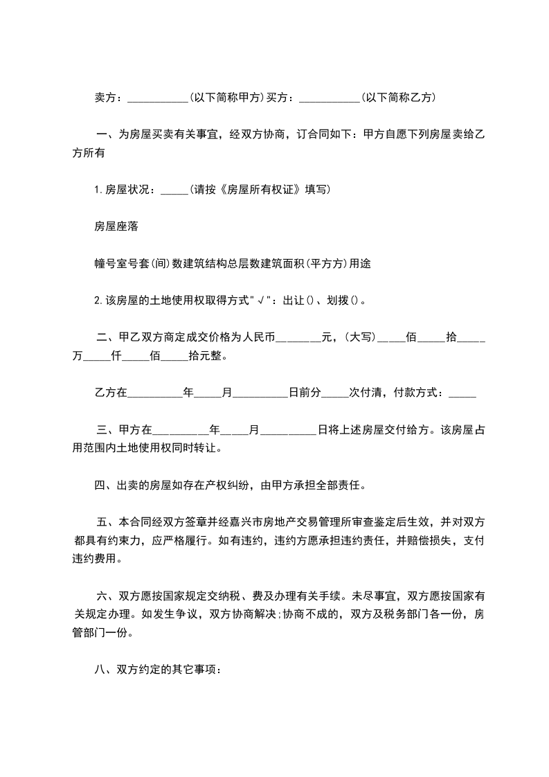 第二条上述房产的交易价格为:单价:人民币________元/平方米,总价:人民币___________元整(大写:____佰____拾____万____仟____佰____拾____元整)本合同签定之_____日,乙方向甲方支付人民币__________元整,作为购房定金。