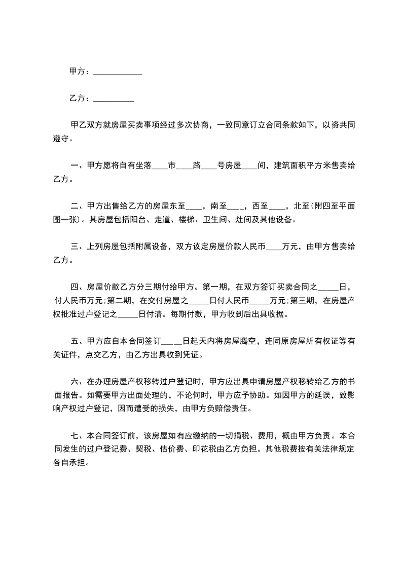 2、甲乙双方同意以一次性付款方式付款,并约定在房地产交易中心缴交税费当_____日支付首付款(含定金)人民币____拾____万____仟____佰____拾____元整给甲方,剩余房款人民币____________元整产权交割完毕当_____日付给甲方。
