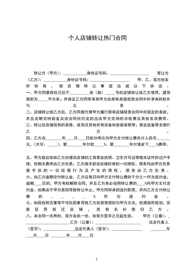 转让方(甲方):____________身份证号码:____________________ 受让方(乙方):____________身份证号码:____________________ 甲、乙、双方经友好协商,就店铺转让事宜达成以下协议: